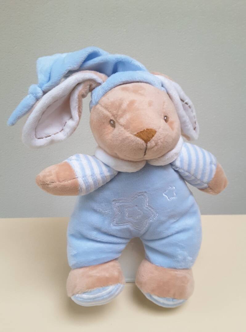 Een soortgelijke blauwe luierwieg kan op bestelling worden gemaakt. De wieg bevat een zachte haas
