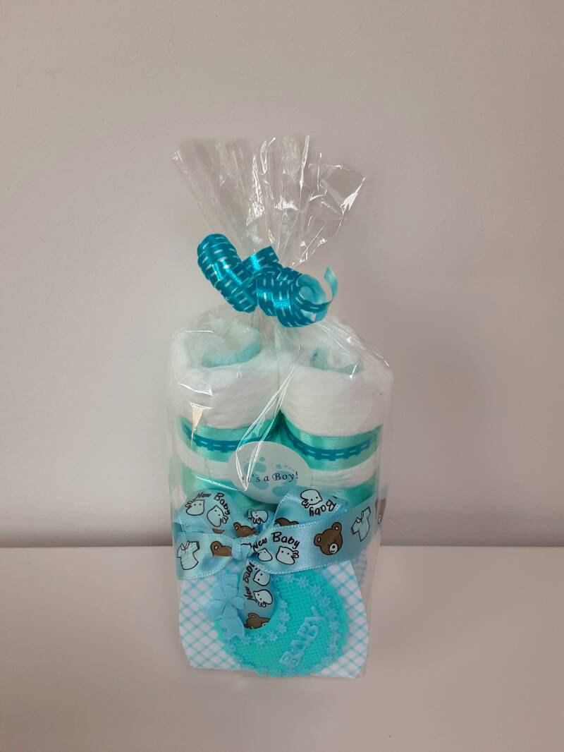 Kleine blauwe luiertaart met 7 pampers maat 2, een decoratie flesje en twee kaarsjes. Keuze uit twee